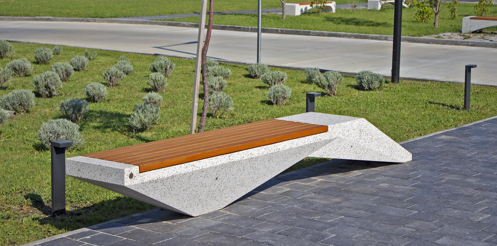 Klupa je izrađena od visokokvalitetnog armiranog betona i poliranog agregata. Strukturalni mramor i granit, budući da su prirodni, imaju potencijal za različite kombinacije boja. Betonska klupa kombinirana je s certificiranim tvrdim drvom bambusa. Dodatna obrada polirane površine zaštitnim premazom čini proizvod još otpornijim na agresivne vremenske uvjete i smanjuje taloženje prljavštine.