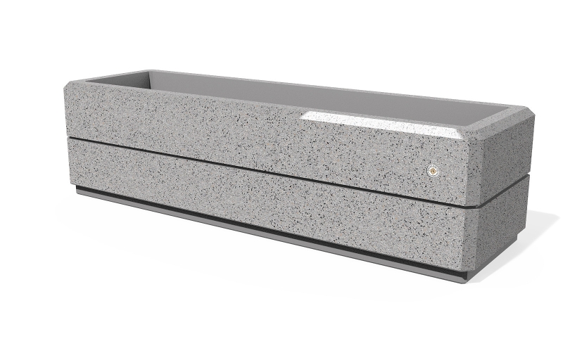 Elegantna, pravokutna, betonska žardinjera u kojoj su oblik, boja i tekstura skladno spojeni. Optimalan omjer visine i duljine nadopunjen je delikatnim središnjim ukrasnim kanalom koji daje individualnost i stil. Posuda za cvijeće izrađena je od betona visokih performansi i agregata prirodnog mramora ili granita. Agregat je dostupan u različitim varijacijama boja njegovih sastavnih čestica. Suvremenim metodama obrade strukture agregata stvara se karakterističan reljef. Na reljefnu površinu nanosi se poseban zaštitni premaz. Time se stvara još veća otpornost proizvoda na nepovoljne vremenske uvjete i smanjuje taloženje prljavštine. Beton je armiran i ojačan vlaknima. Žardinijera je izvrstan izbor za uređenje različitih urbanih prostora kao i hotela, privatnih posjeda i vrtova.