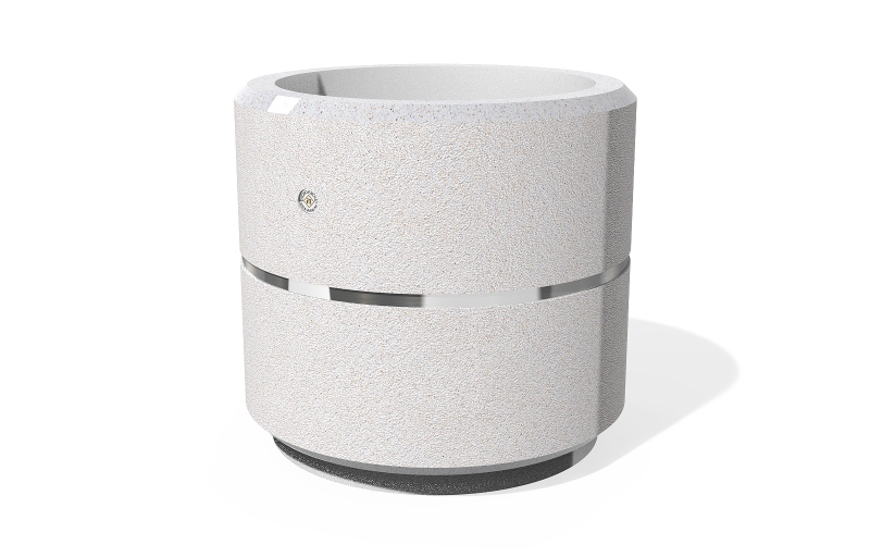 Model iz serije okruglih betonskih žardinjera u kojoj su dizajneri ponudili odličan omjer visine i promjera, pretvarajući svaki park, trg ili uličicu u remek-djelo umjetnosti. Posuda za cvijeće izrađena je od visokoučinkovitog betona i prirodnog reljefnog agregata. Struktura agregata je sastavljena od prirodnog mramora ili granita specifičnih dimenzija. Površina je obrađena posebnim zaštitnim premazom. Smanjuje taloženje onečišćenja i dodatno povećava otpornost proizvoda na agresivne vremenske uvjete. Beton je armiran i ojačan vlaknima. Dekoracija zrcalnom krom-nikal trakom i mogućnosti različitih varijacija boja strukture agregata daju individualnost i stil. Klasičan okrugli oblik žardinijere čini je pogodnom za širok raspon ukrasnog bilja.